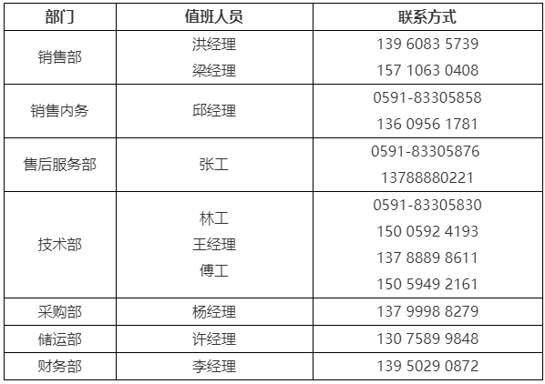 3、公(gong)司各部門值(zhi)班人員及聯(lian)系方式如下(xia):