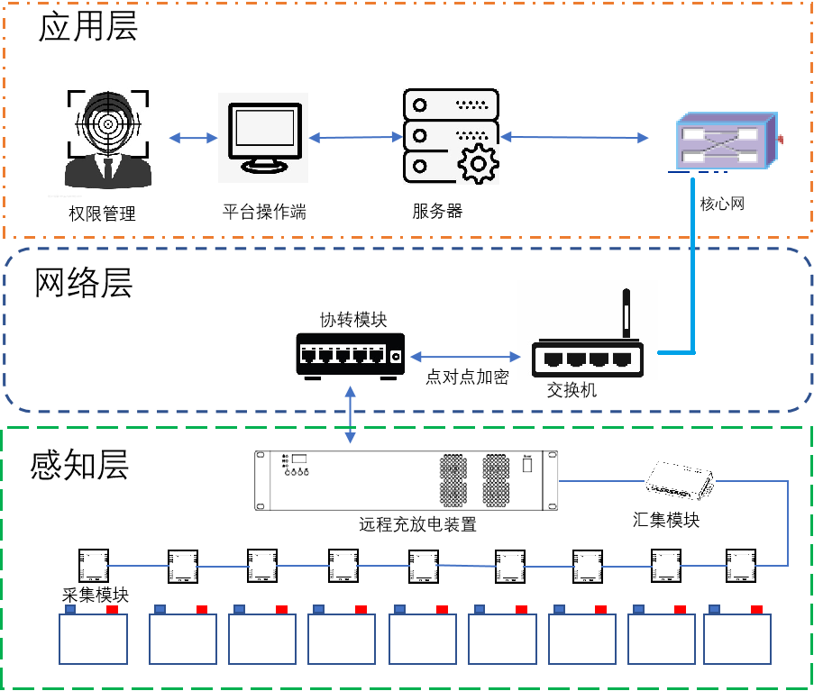 基于(yú)現有石化通信網(wang)絡,研制以電池采(cai)集模塊和遠程充(chong)放電裝置爲物理(lǐ)感知層;各模塊間(jian)的通訊及控制爲(wei)網絡交互層;智能(néng)運維平台軟件爲(wèi)平台層的蓄電池(chí)組遠程智能運維(wei)系統。