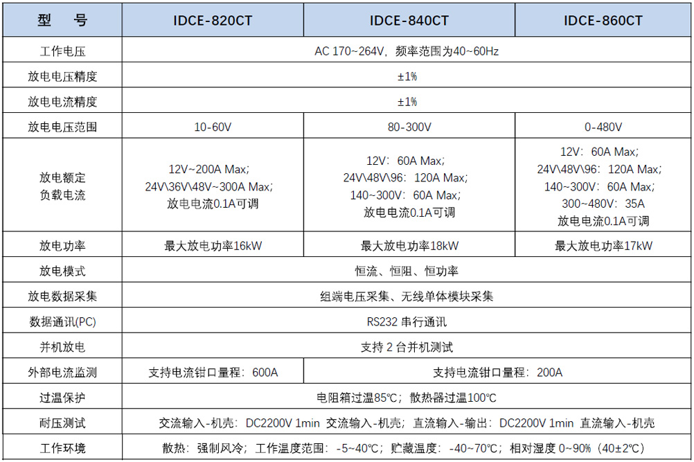 IDCE-820/840/860CT電池寬電(dian)壓放電容量測(cè)試儀采用寬電(dian)壓設計,一台儀(yí)表就可滿足多(duō)種電壓等級的(de)電池組測試。