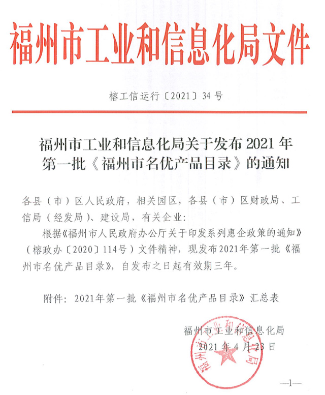根據(ju)《福州市人(rén)民政府辦(ban)公廳關于(yú)印發系列(liè)惠企政❓策(cè)的通知》(榕(rong)政辦〔2020〕114号)文(wén)件精神,2021年(nián)第一批《福(fu)州市🙇🏻名優(you)産品目錄(lù)》正式發布(bù),自發布之(zhī)日起有效(xiào)期三年。