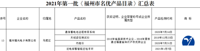 福(fu)州福光電(dian)子有限公(gong)司自主研(yán)發生産的(de)“通信蓄電(dian)池遠程核(he)容系統、天(tian)線姿态測(ce)試儀、内阻(zu)儀、近電報(bao)警🙇♀️智能✊巡(xun)檢手環”四(si)款産品成(cheng)功入選第(dì)一批《福州(zhou)市名優産(chǎn)品目錄》!