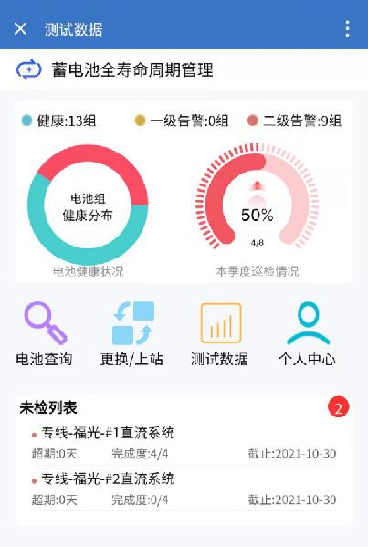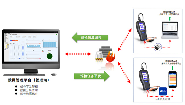 作業(yè)任務信(xìn)息以及(ji)完成情(qíng)況統計(ji)信息,自(zì)動接收(shou)雲端智(zhi)能平台(tai)上創建(jian)的測試(shì)蓄電池(chi)組信息(xī),并手動(dong)同步到(dao)蓄電池(chi)内阻測(ce)試儀上(shàng)。
