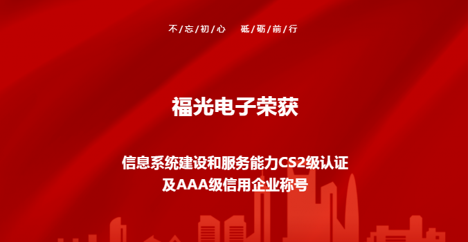 近日(rì),福光電子順利(lì)通過了由中國(guó)電子信息行業(ye)聯合會評審的(de)信息系統建設(she)和服務能力評(ping)估體系認證,并(bìng)獲得CS2級證書!公(gong)司信息系統建(jian)設及服務能力(li)再獲認可。同期(qi),福光電子再次(cì)榮獲“AAA級信用企(qi)業”稱号,并頒發(fā)資質牌匾與證(zheng)書。