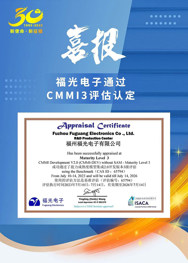 近日,福州福(fu)光電子有限公(gong)司正式通過 CMMI研(yan)究院質量團隊(duì)審核的CMMI3(軟件能(neng) 力成熟度模型(xíng)集成三級)評估(gu)認定,标志着福(fú) 光的研發生産(chǎn)中心在軟件工(gong)程服務和過程(chéng)管理