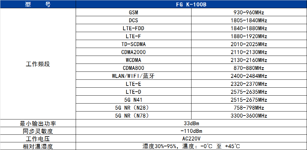 ● 對各制式頻(pin)段基站上行(hang)接收不産生(sheng)幹擾, 設備在(zai)無法正常同(tóng)步時,無上行(háng)頻段發射